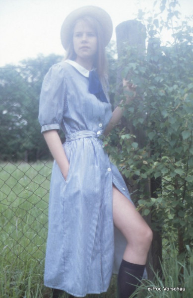 Dieses spezielle Dia fängt eine sinnliche Szene in einem ländlichen Setting ein und zeigt eine junge Frau in einem gestreiften Hemdkleid, akzentuiert mit einem eleganten Gürtel, die verträumt in die Ferne schaut. Der nostalgische Charme des Bildes, gepaart mit der Qualität und Detailtreue der Aufnahme, machen es zu einem Muss für Sammler und Liebhaber sowohl künstlerischer Fotografie als auch spezieller historischer Erotik.