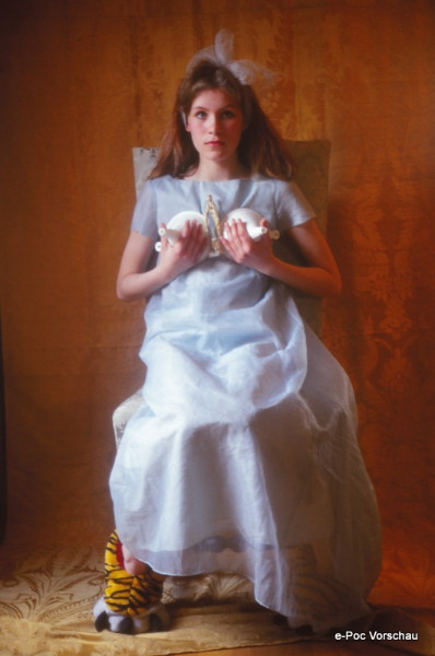 Das Bild zeigt eine junge Frau in einem himmelblauen Kleid, die mit naiver Unschuld und einer Spur von Mystik posiert. Ihr Blick ist tief und durchdringend, was dem Bild eine außergewöhnliche Tiefe und Intensität verleiht. Umspielt von einem weichen Orangefarbenen Hintergrund, der ihre sanfte Erscheinung hervorhebt, sitzt sie auf einem Stuhl, während zwei auf ihrer Hand ruhende weiße Vögel und ein verspielt blickender Plüschtiger zu ihren Füßen, die Szene mit Surrealität und einem Hauch von Verspieltheit bereichern.