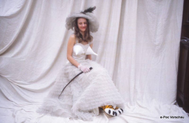 Die Bildkompositionen sind hervorragend durchdacht und bieten außergewöhnliche Details, die jedes Dia zu einem kleinen Kunstwerk machen. Auffällige Accessoires, wie bunte Hausschuhe und weiße Stoffhandschuhe, setzen originelle Akzente und verleihen den Bildern eine spielerische und zugleich provokante Note. Diese seltene Mischung aus formeller Ästhetik und verspielten Elementen wirkt unwiderstehlich anziehend.