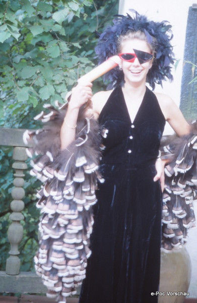 - Diese besondere Aufnahme besticht durch ein außergewöhnliches Kunstwerk. Sie zeigt eine Frau in einem eleganten, schwarzen Abendkleid und einer auffälligen Federboa. Die kontrastreiche Komposition und die extravaganten Accessoires fangen den Betrachter sofort ein und zeigen die Kreativität und den Einfallsreichtum des Produzenten.