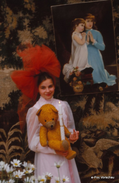 Tauche ein in die verführerische Welt des renommierten Erotikproduzenten Dominik Alterio mit dem exklusiven Dia Nachlass Erotikproduzent Dominik Alterio P2-4. Dieses seltene Dia aus seinem Nachlass ist eine echte Rarität für Sammler und Liebhaber einzigartiger, künstlerischer Erotik. Das Bild zeigt eine junge Frau in einem zarten, weißen Kleid, die ein Stofftier hält und neben einem Gemälde von zwei betenden Mädchen steht, was eine interessante Kontrastierung zwischen Unschuld und erweckter Sinnlichkeit darstellt.