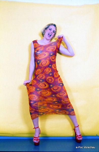 Eindrucksvoll und sinnlich, präsentiert dieses ungerahmte Erotikdia eine darstellende Person in einem auffällig gemusterten, transparenten Kleid in Rottönen. Dieses Kunstwerk steht in der Kategorie "Erotik, Fotos, Dias" und besticht durch seine dynamische und selbstbewusste Pose, die sowohl Spannung als auch spielerische Sinnlichkeit ausstrahlt.