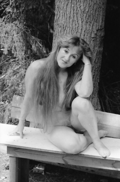 Auf dem Bild erwartet Dich ein intimer Outdoor-Moment: Eine nackte Frau sitzt entspannt auf einer hölzernen Bank, direkt neben einem kräftigen Baumstamm. Das Setting wirkt natürlich und ungestellt – Wald, Struktur des Holzes, weiche Lichtstimmung. Der Blick in die Kamera ist ruhig und selbstbewusst, gleichzeitig zart und einladend. Genau diese Mischung macht den Reiz aus: klassische Erotik ohne Kitsch, dafür mit echtem Analog-Charakter.