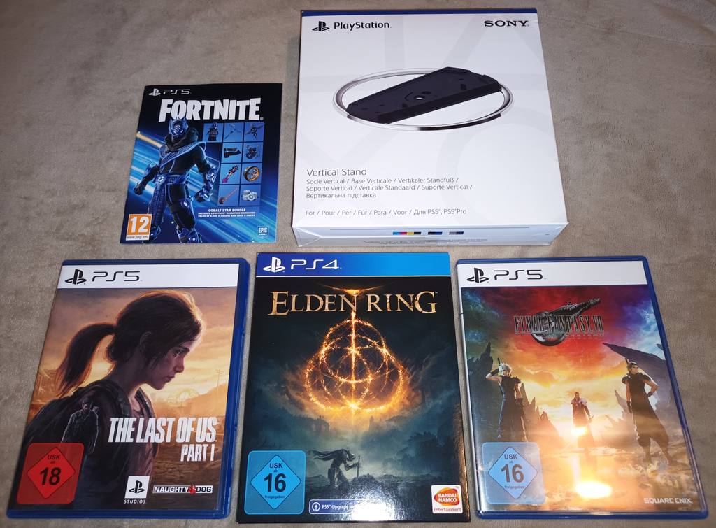 Zum Zustand der 5 Artikel: Die 3 Spiele wurden lediglich 1x kurz angespielt und befinden sich in einem rundum absolut neuwertigen und kratzerfreien Zustand. Die Launch-Edition von "Elden Ring" enthält zusätzlich alle Bonusinhalte in einem ebenso neuwertigen Zustand, die auf der Cover-Rückseite des Spiels (s. 2. Bild) aufgeführt werden. Der Cobalt-Star-Code für die PS5-Version von Fortnite ist brandneu und uneingelöst (s. Bild 1+2).