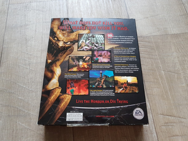 Verkaufe die sehr seltene und originale Erstausgabe der US BIG BOX der PC Version von Clive Barkers Undying aus dem Jahre 2001. Sie erkennen die US Version an dem "M" (Mature) Zeichen unten auf der Vorderseite der Box. Auf der Rückseite finden Sie den "Mature" Schriftzug ebenfalls.