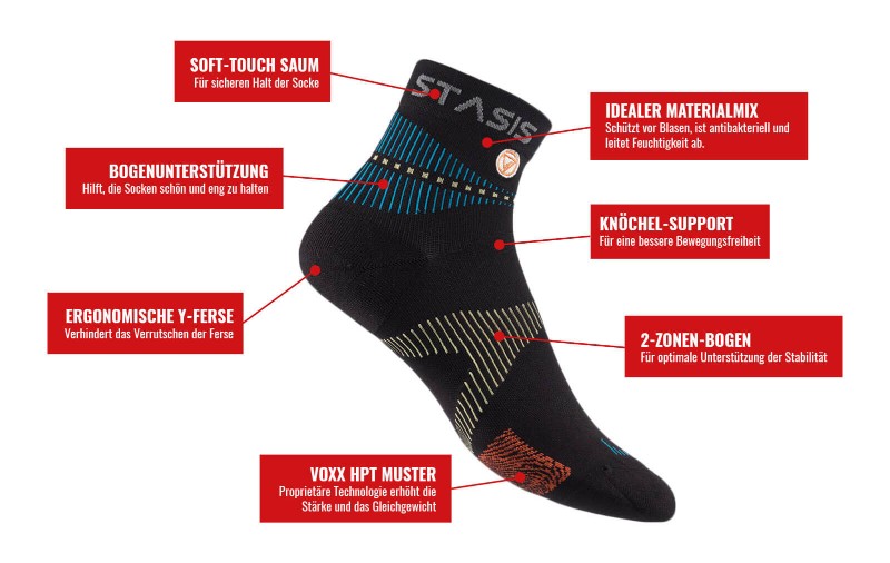 VOXX STASIS ATHLETIC MINI-CREWModerne Technologie und Forschung in einer Socke. Unsere VOXXLife Neuro Socks sind ausgestattet mit der VOXX Human Performance Technology (HPT). Das eingewebte, spezielle Muster auf der Fußsohle kann dazu beitragen, dass wir uns besser fühlen, eine bessere Haltung haben, aufrechter gehen und so ein besseres Wohlbefinden sowie eine bessere Lebensqualität erlangen.